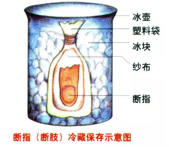 专家接着说,当伤员要转运到外地进行再植手术时,转运途中对断指的保存更为重要。做法是,把断指用8至10层无菌纱布包好,放到无孔塑料袋中,扎紧口后放在冰筒中,在袋外放一些冰块,没有冰块放一些冰糕或雪糕也可以。但不要将断指放到酒精、甲醛等消毒液中,也不要放到生理盐水中浸泡。》》》还想继续了解其他关于断指的问题?点击了解