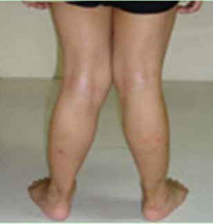 导读: X型腿在医学上称为膝外翻。X型腿患者膝关节向内突出,两小腿呈外展状,双膝并拢,两踝关节不能靠拢,留有较大的间隙。X型腿轻者跑步时呈摇摆状;严重者走路时膝关节屈曲、步幅小、频率快,呈严重的摇摆状,极不雅