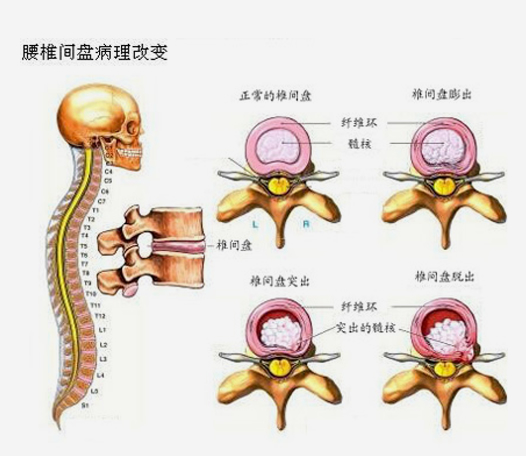 腰椎间盘突出症,亦可称髓核突出或腰椎间盘纤维环破裂症,主要是因为腰椎间盘各部分(髓核、纤维环及软骨板)尤其是因为腰椎髓核,有不同程度的退行性改变加之外界因素,导致纤维环破裂,髓核突出刺激或压迫神经根、马尾神经所表现的一种综合症。腰痛是腰椎间盘突出典型症状。